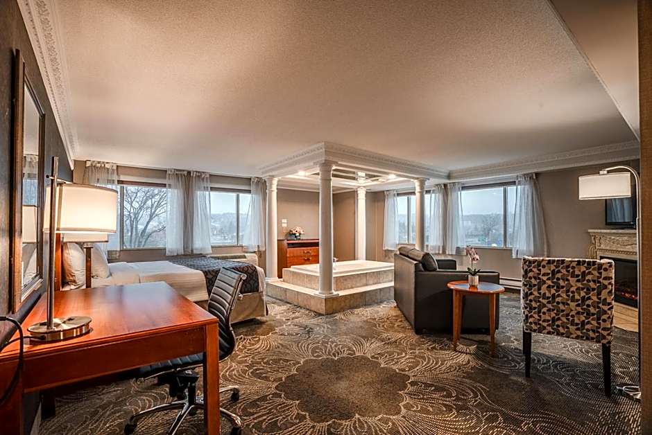 This suite features a hot tub and a fireplace. The air-conditioned suite has 1 bedroom and 1 bathroom with a bath and a shower. The suite features a tea and coffee maker, a seating area, a safe deposit box, a flat-screen TV with streaming services, as well as city views. The unit has 1 bed.